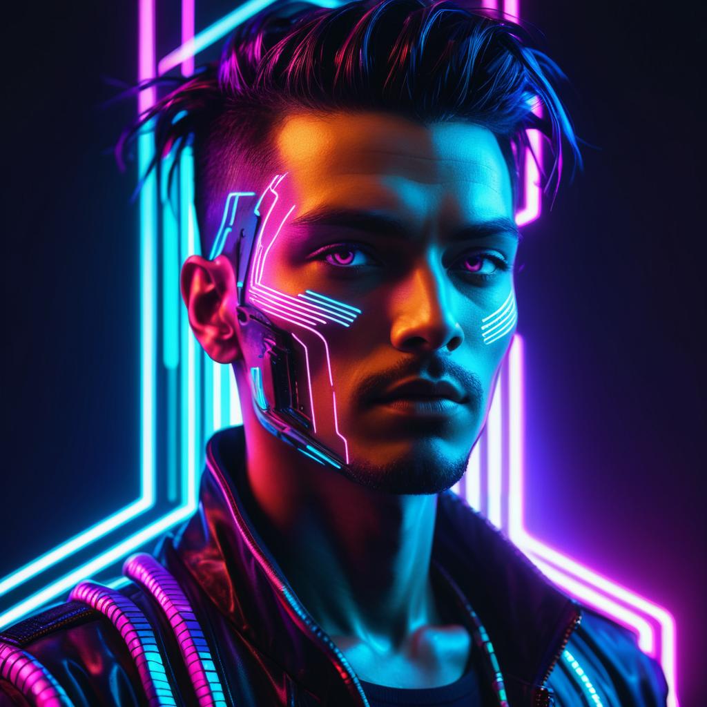 Portrait of a young man with neon glowing face paint and LED lights on his black jacket, set against a dark background. The colorful neon lines create a cyberpunk and futuristic aesthetic, highlighting the contours of his face and hair.