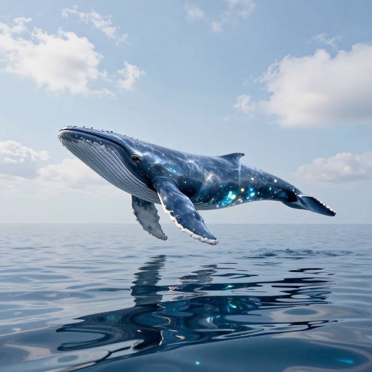 Photorealistic digital artwork of a massive humpback whale leaping out of the calm, reflective ocean. The whale's textured, dark blue and gray body glistens with water droplets and highlights, while its large, white pectoral fins are prominently visible. The sky above is bright blue with scattered fluffy white clouds. The water below mirrors the whale's image, creating a symmetrical reflection. The scene evokes a sense of serene majesty and natural beauty. The overall color palette includes shades of blue and white, enhancing the tranquil atmosphere.