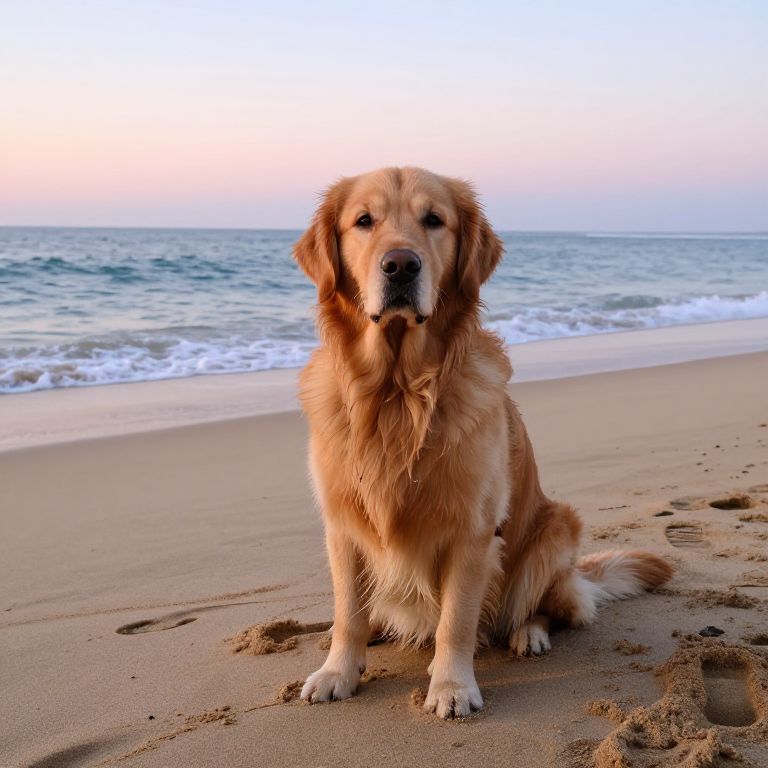 Photograph of a golden retriever sitting on a sandy beach at sunset, with gentle waves in the background and a pastel-colored sky.