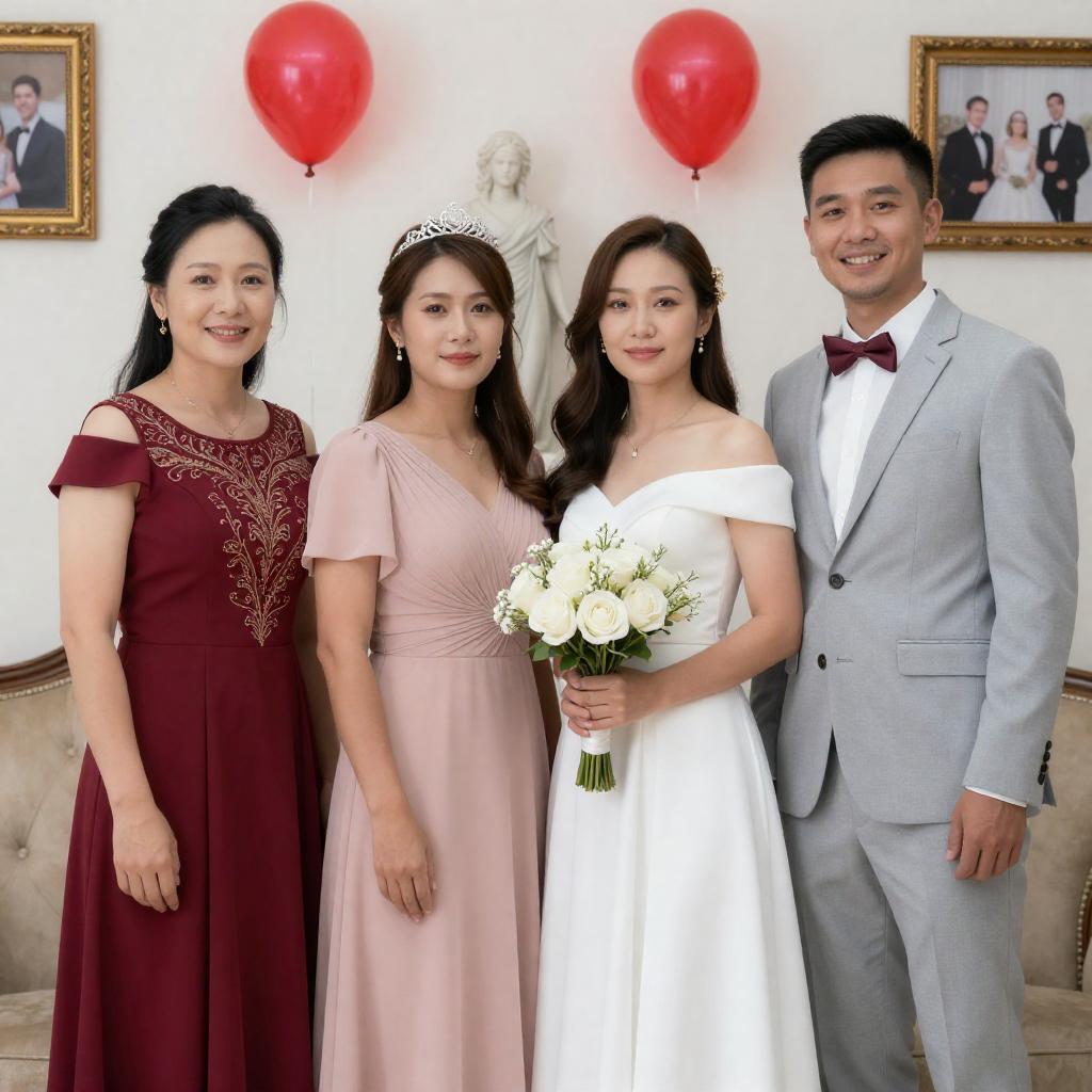 Portrait of a wedding party featuring three Asian women in formal dresses and a smiling man in a light gray suit with a burgundy bow tie. The woman in the center right wears a white off-shoulder wedding gown and holds a bouquet of white roses. The woman next to her is dressed in a soft pink gown with a tiara, while the woman on the far left wears a burgundy dress with gold embroidery. The background includes two red balloons, a white statue, and framed wedding photos.