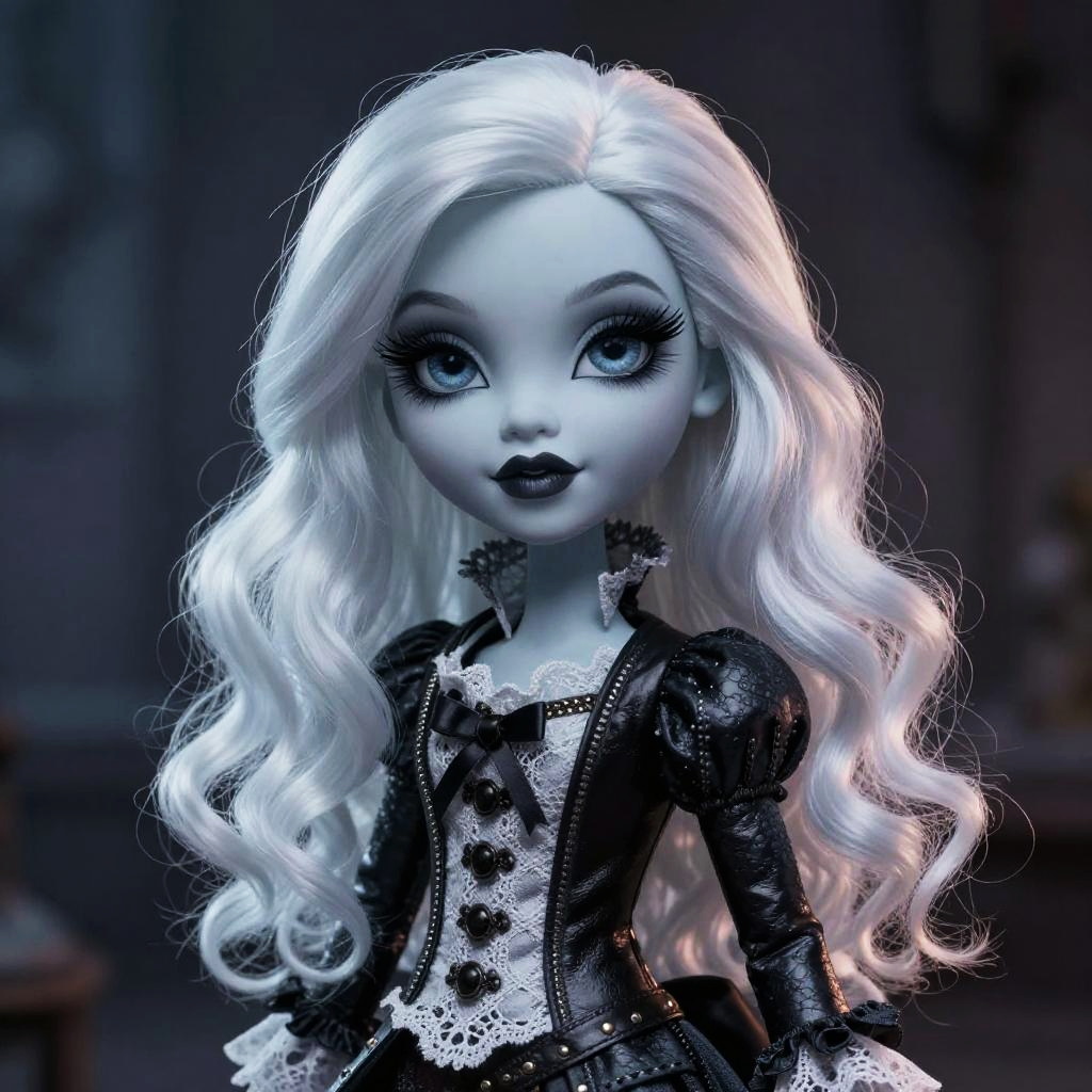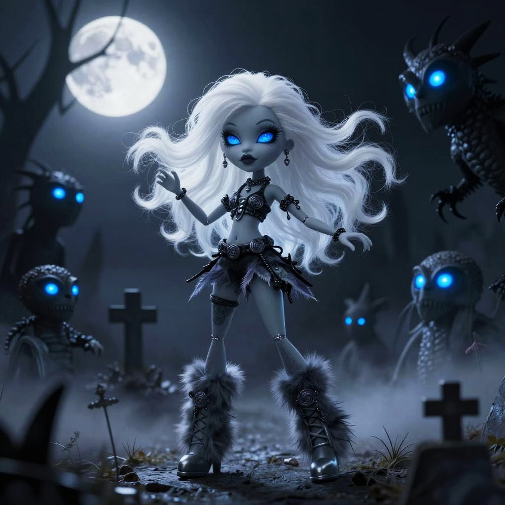 Monster High white hair character posed on a rooftop at twilight, striking a confident pose with windswept white hair, leather jacket with metal studs and chains, urban gothic environment with neon lights and dark purple sky, stylish and moody atmosphere.