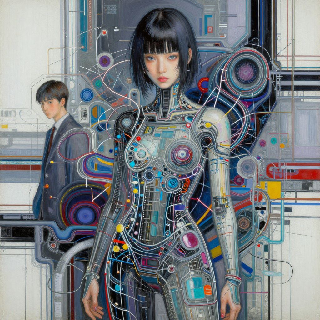 This digital artwork features a futuristic, cyberpunk-style scene with a central focus on a young woman with pale skin and straight, black bob-cut hair. She stands in the foreground, wearing a form-fitting, metallic outfit adorned with colorful, circular and linear patterns resembling circuitry and technology. Her expression is neutral, and her eyes are slightly downcast. In the background to the left, a young man with short, brown hair and fair skin, dressed in a dark suit, stands with his back to the viewer, looking away. The background is a complex, abstract mix of technological elements with white, black, and colorful geometric shapes. The overall style is highly detailed and vibrant, blending elements of science fiction and digital art.