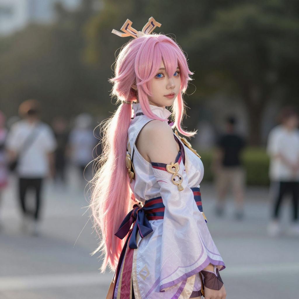 Photo-realistic cosplay photo of person standing in momoyama mirai costume. 1girl, blue eyes, purple eyes, pink hair, long hair, sidelocks, ponytail, high ponytail, hair bowfull body shot. lifestyle stock photo, shallow depth of field, lifestyle stock photography, shallow depth of field, natural lighting, warm tones, soft background blur, vibrant colors, realistic textures, professional photoshoot