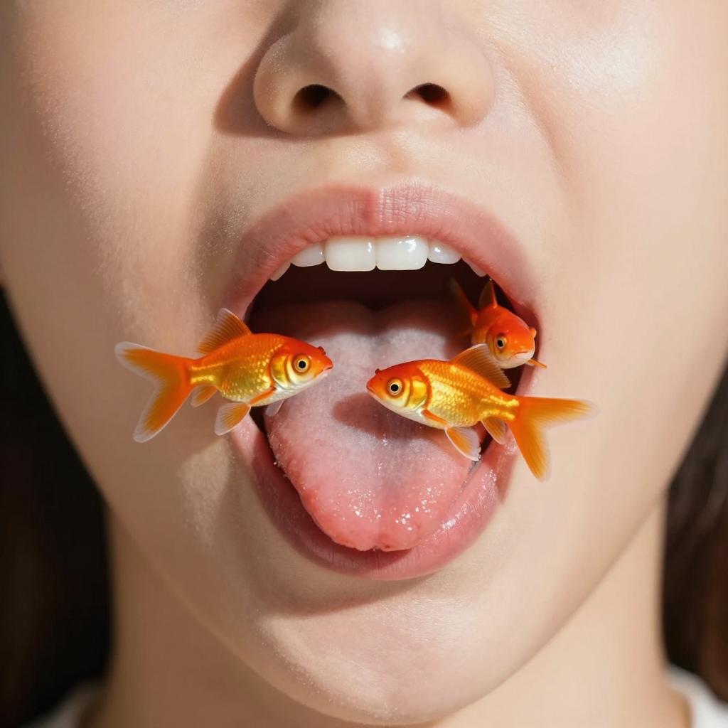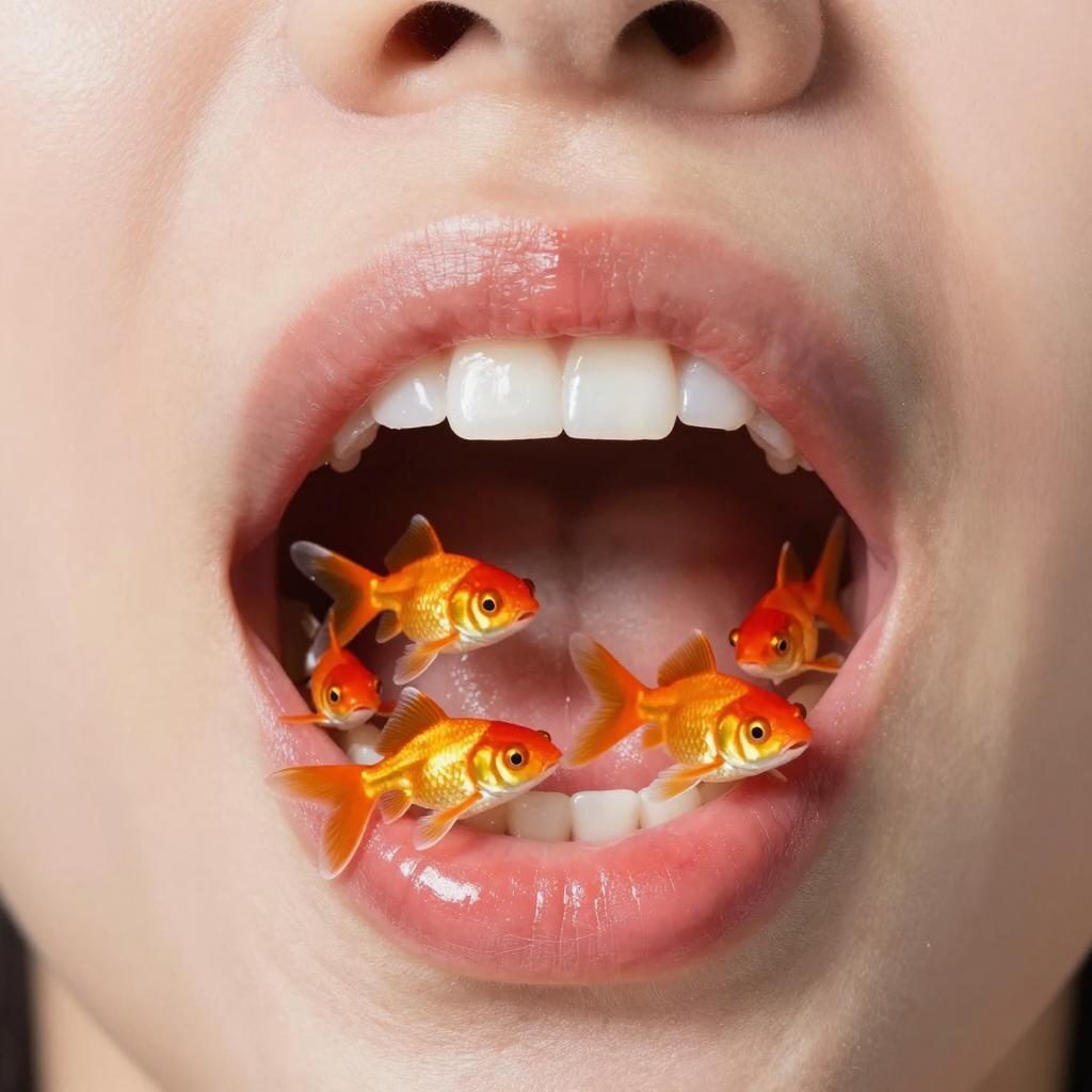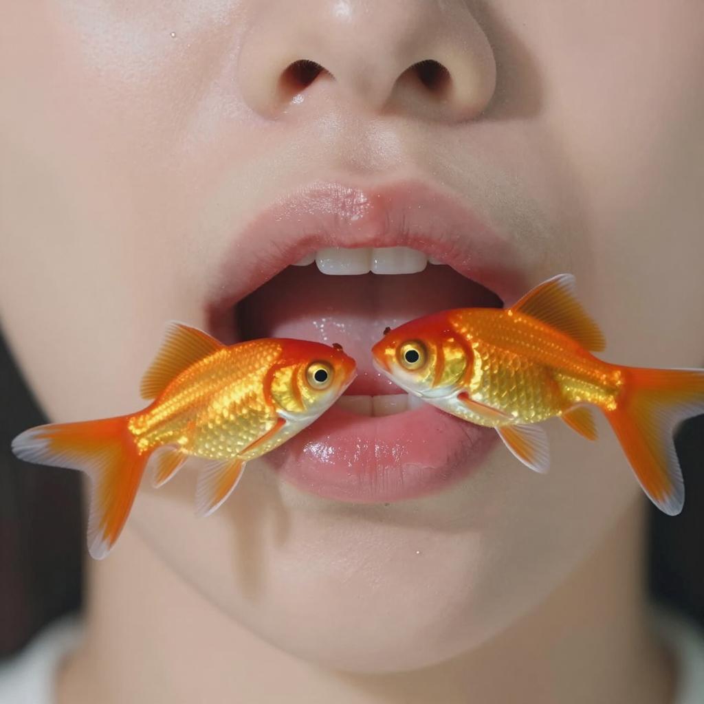 Close-up photo of a person's mouth with shiny, pink lips. Several small, orange goldfish swim inside the mouth, some on the upper lip and some on the lower lip. White teeth are visible in the center. Light skin.