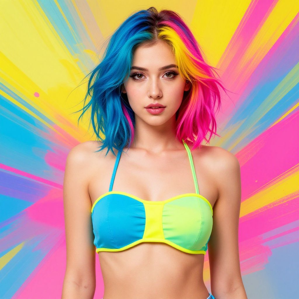A vibrant digital artwork of a young woman with colorful hair featuring shades of blue, yellow, and pink. She wears a neon blue and yellow bandeau bikini top with removable padding, set against a dynamic background filled with bright, paint-like streaks that emphasize the lively and modern style of the piece.