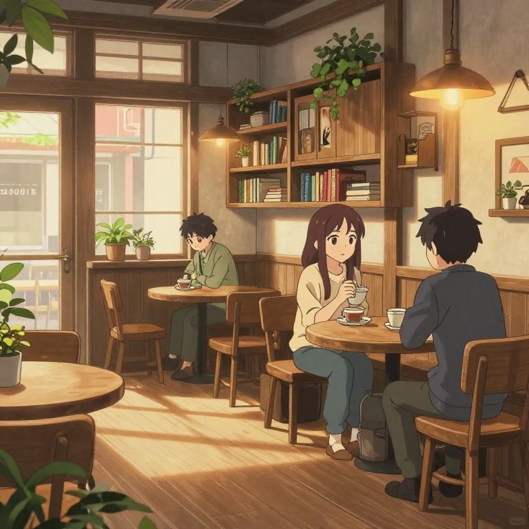 Anime:uwebu7luugw= cozy interior of a small café in an anime world, warm lighting, detailed wooden furniture and shelves filled with books and plants, characters enjoying tea, soft shadows and atmospheric perspective, hand-drawn aesthetic