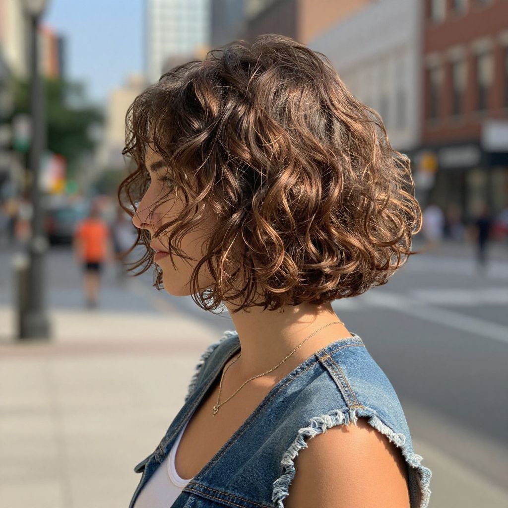Photograph of a young woman with a short, wavy brown bob haircut, facing left in profile. She wears a denim sleeveless vest over a white top, with a delicate gold necklace. Her skin is lightly tanned. The background shows a sunlit urban street with blurred pedestrians, buildings, and streetlights, creating a vibrant, cityscape atmosphere. The image has a sharp focus on her face and hair, with a shallow depth of field, making the background softly blurred. The lighting highlights the texture of her hair and denim vest.