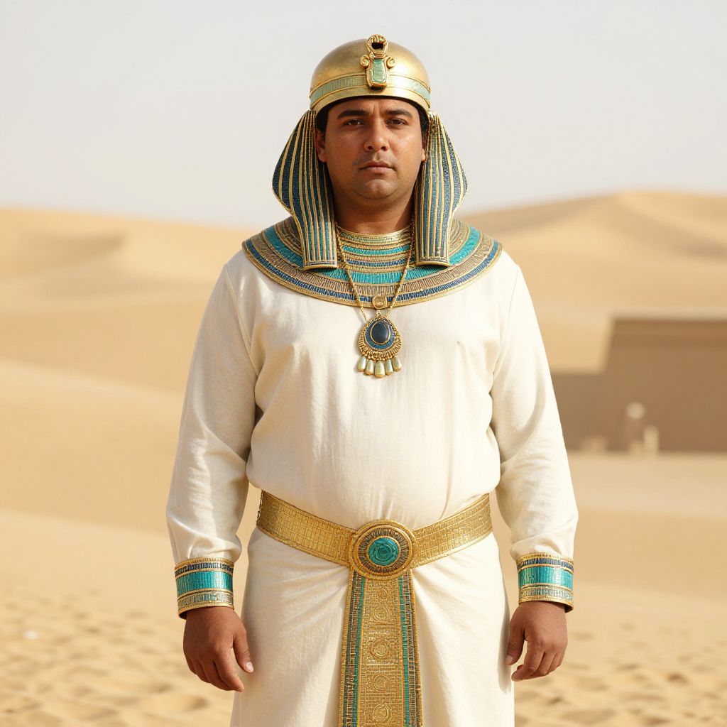 Photograph of a Middle Eastern man standing in a desert, dressed in an ancient Egyptian-inspired outfit. He wears a white tunic with gold and turquoise embroidery, a matching striped headdress, and a gold belt with a central turquoise gem. His tunic and headdress are adorned with intricate patterns. The man has a medium build, dark skin, and a neutral expression. The background features a blurred, sandy desert with a small, rectangular structure to the right. The lighting is bright, casting soft shadows. The image has a vivid, slightly exaggerated color style.