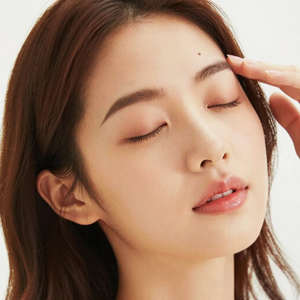 Close-up photo of a young woman with light brown hair and fair skin, eyes closed in relaxation. She has a small mole above her right eyebrow and glossy pink lips. A hand is gently touching her right eyebrow, with manicured nails visible. The background is bright white, making her face the focal point. The image has a soft, almost dreamy quality.