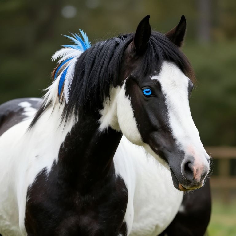 Flannel Black and white Overo Horse, with blue and white feathers in mane, Native american horse, beautiful black mane, Baby blue eyes, Photo Realistic, Forest background, detailed, octane render,