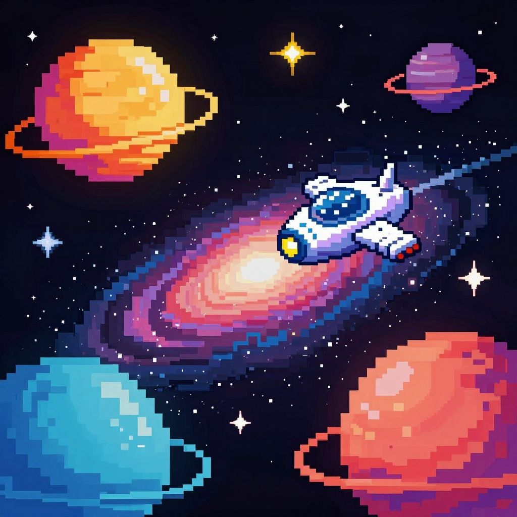 Pixel art space scene with vibrant planets, twinkling stars, and a retro spaceship flying through a colorful galaxy, detailed pixel textures, 8-bit style vibrant colors