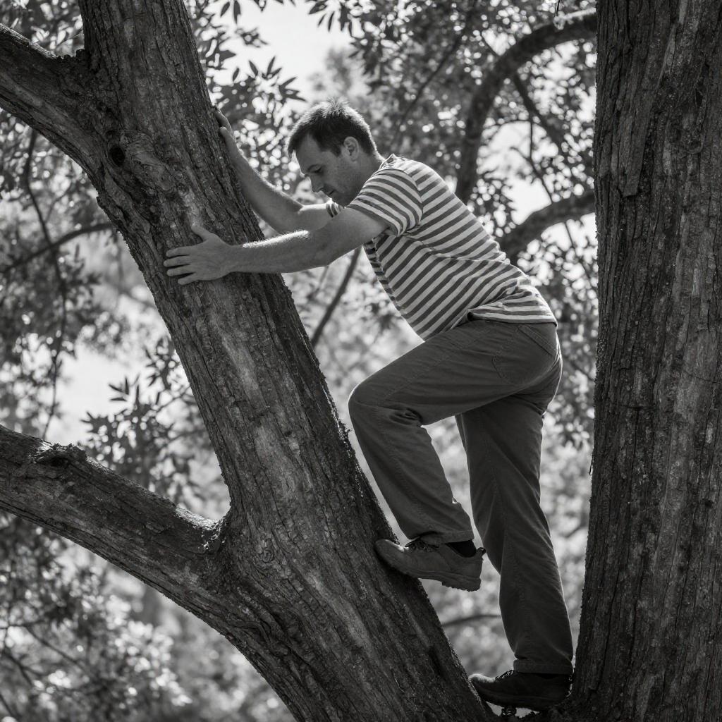 Black-and-white photograph of a man with short hair, wearing a striped shirt and pants, climbing a large, rough-barked tree. He leans forward, gripping the trunk with both hands, looking downward. Sunlight filters through tree branches.
