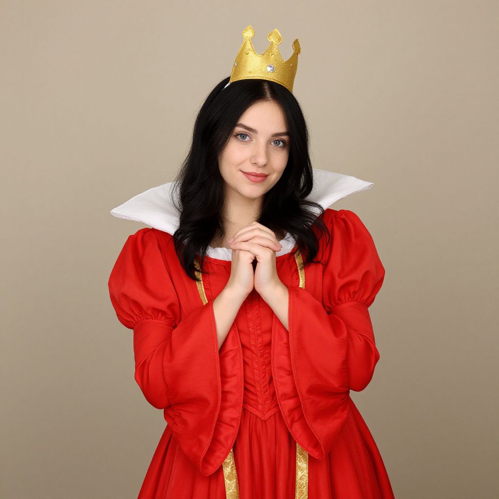 Photograph of a young woman with fair skin and long, wavy black hair, wearing a gold crown with three points. She is dressed in a vibrant red, medieval-style dress with puffy sleeves and a white, triangular collar. Her hands are clasped together in front of her chest, and she has a gentle smile. The background is a plain, light beige, which makes her bright red dress and gold crown stand out prominently. Her blue eyes are slightly almond-shaped, and she has subtle, natural makeup. The image has a soft, studio-lit quality.