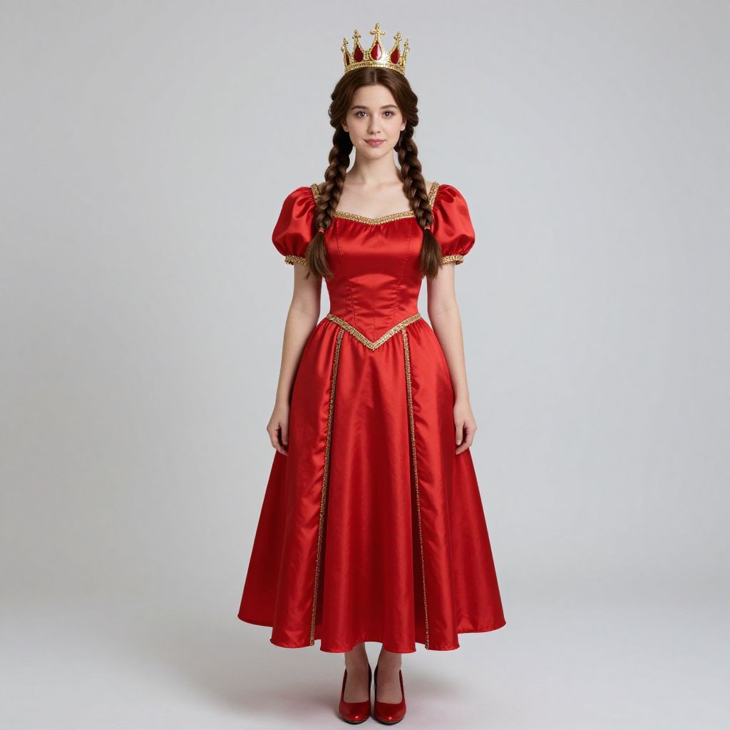 Photograph of a fair-skinned woman with black hair, wearing a gold crown, red medieval-style dress with puffed sleeves, and white collar,