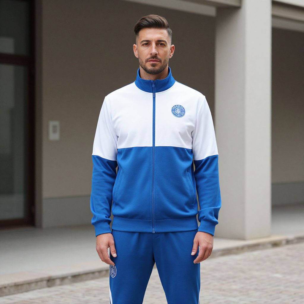 Photograph of a young, fit man with short brown hair and a trimmed beard, standing outdoors against a modern, grey building with large windows. He is wearing a white and blue sports tracksuit with a blue zipper, featuring a team logo on the left chest. The lower half of the tracksuit is blue, while the upper half is white with blue accents. He also wears matching blue track pants with a small logo on the left thigh. The background includes a cobblestone pathway and white pillars. The man's expression is neutral, and he stands with his hands by his sides.