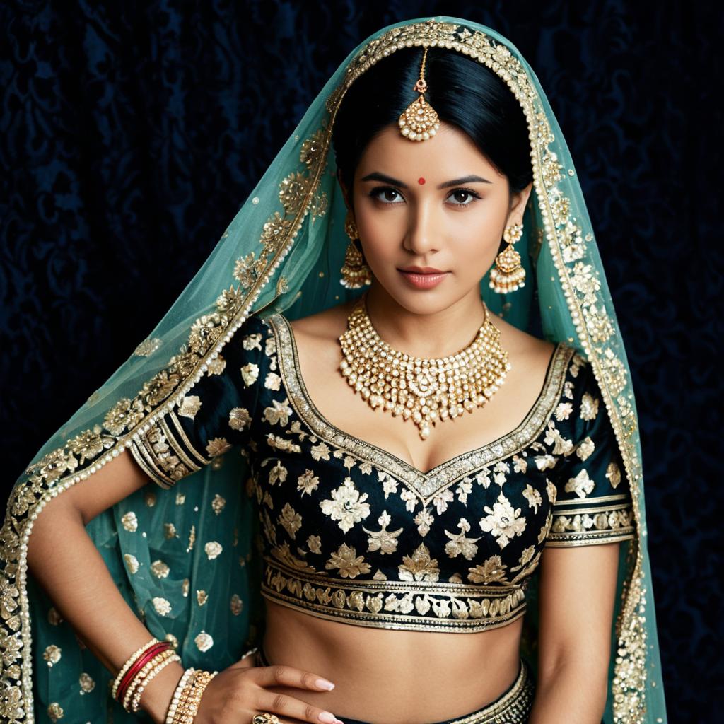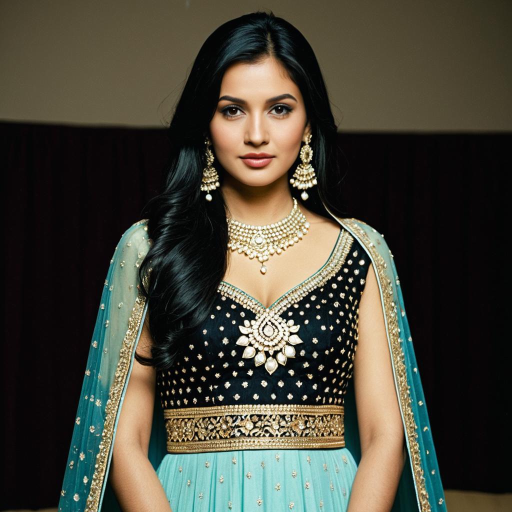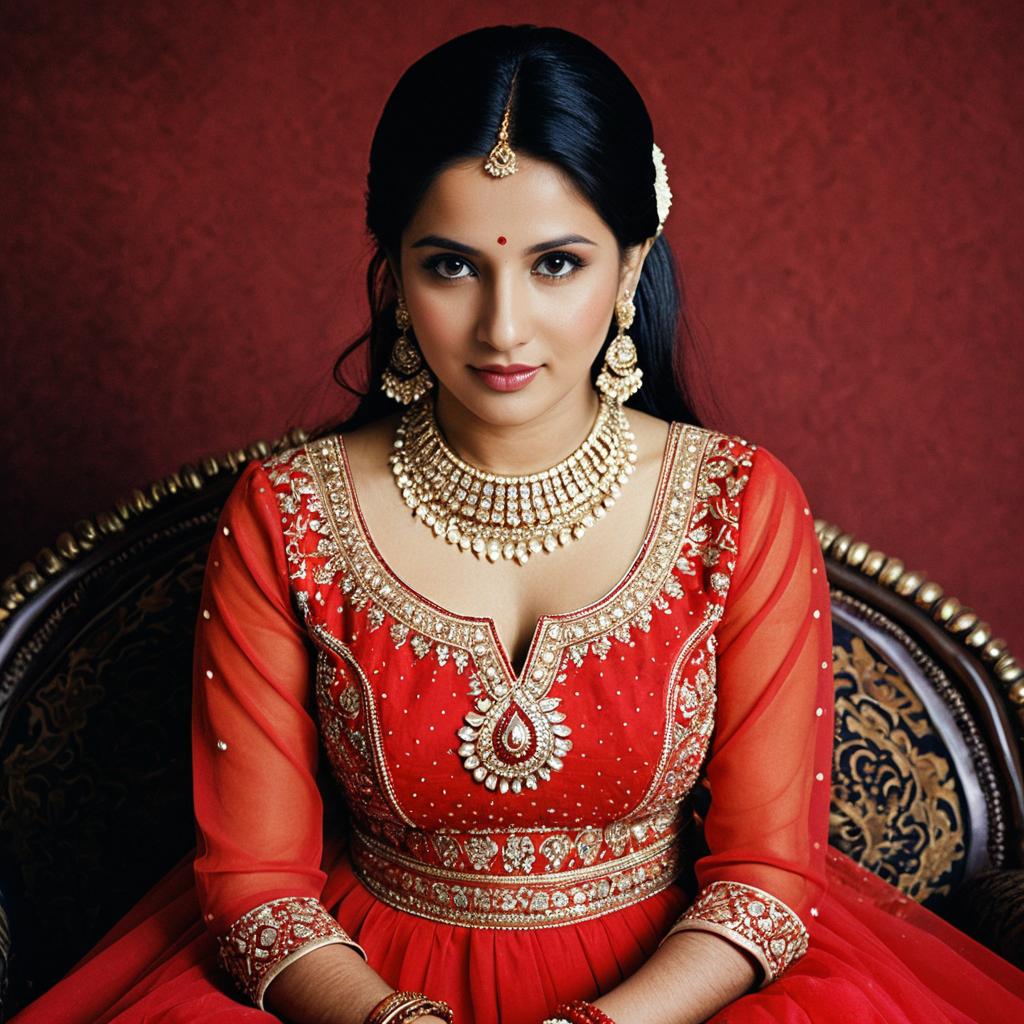 Jodhpuri dress engagement,1girl, jewelry, solo, black hair, earrings, dress, looking at viewer, bracelet, ring, red dress