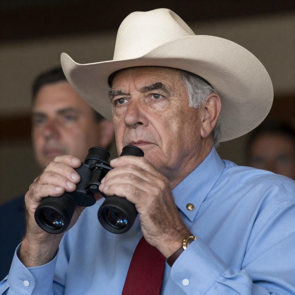 Photograph of an elderly white man with gray hair, wearing a white cowboy hat, light blue shirt, and red tie, holding black binoculars. He has a focused expression. A second person, partially visible, stands behind him. The background is blurred. He wears a gold pin on his shirt.