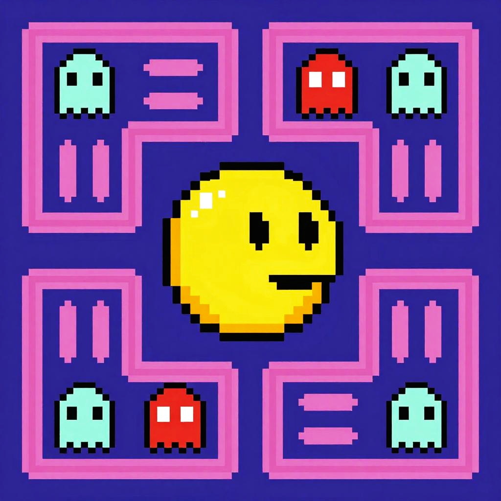Dynamic Pac-Man pixel art portrayal of a chase sequence between Pac-Man and the four ghost enemies, using limited color palette and crisp pixel rendering to mimic the original arcade cabinet aesthetic.
