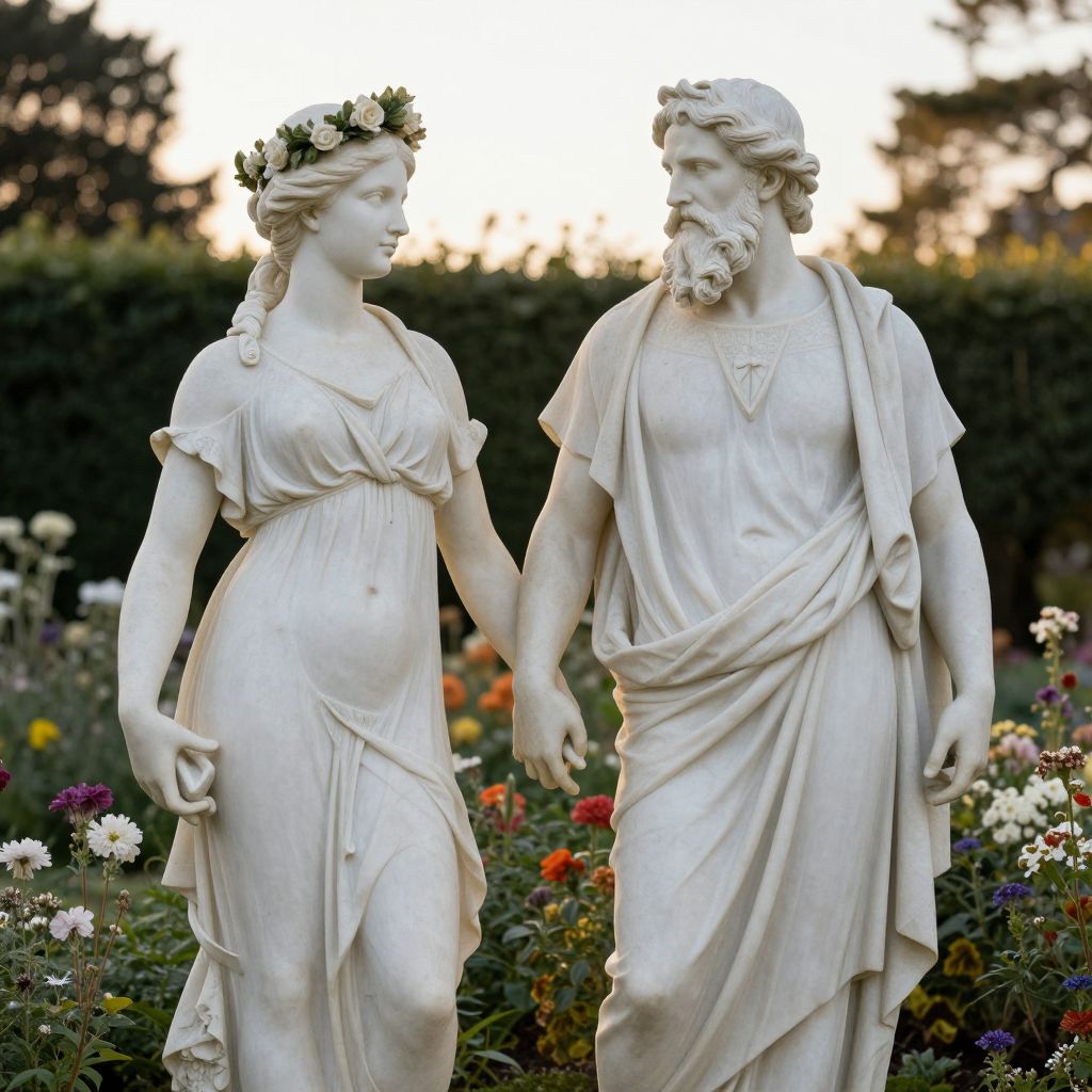 In a serene garden bathed in the golden hour light, classical marble statues of a woman adorned with a floral crown and a bearded man in flowing robes stand hand-in-hand, their timeless forms evoking a sense of philosophical contemplation amidst the living backdrop of blooming flowers and verdant foliage.