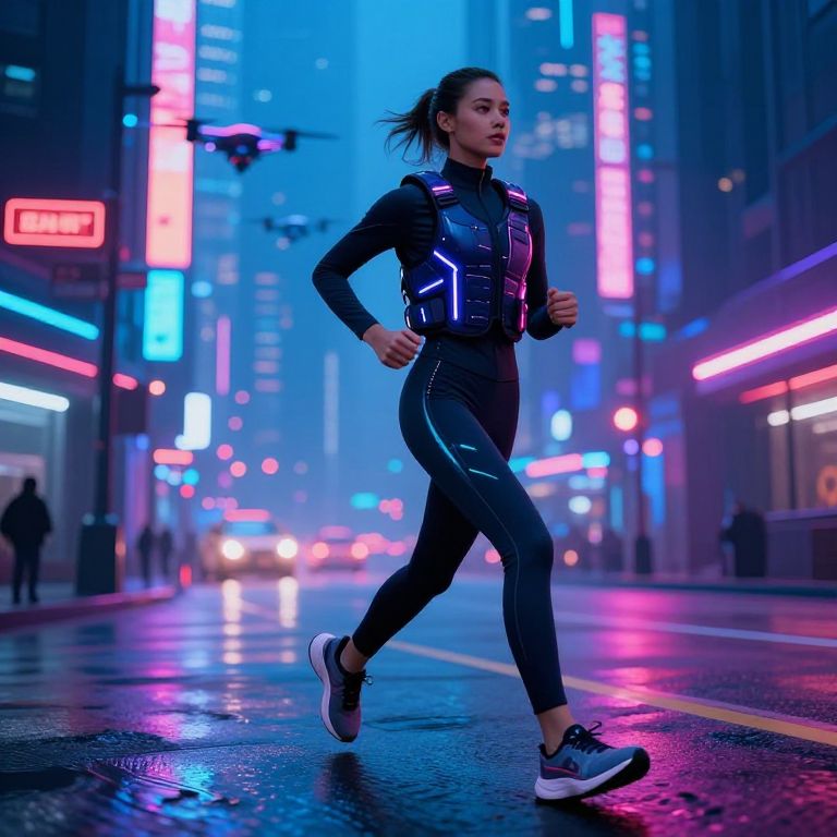 Trendy fanny packs strapped to a futuristic runner's back, city skyline in the distance, digital cityscapes, smartwear elements, reflective surfaces, glowing accents, dynamic motion.
