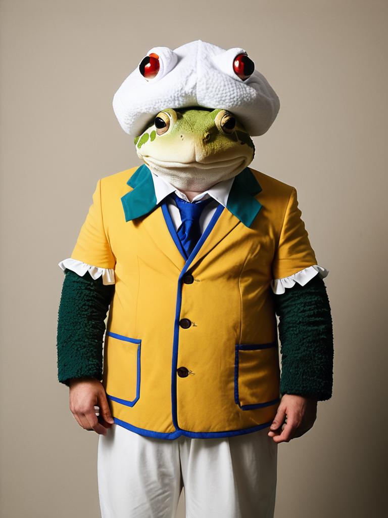 Realistic photo of a man wearing a Toadsworth costume featuring a large frog head mask with white hat and red eyes. The outfit includes a yellow blazer with green collar and blue trim, blue tie, white pants, and green textured sleeves, standing against a plain background.