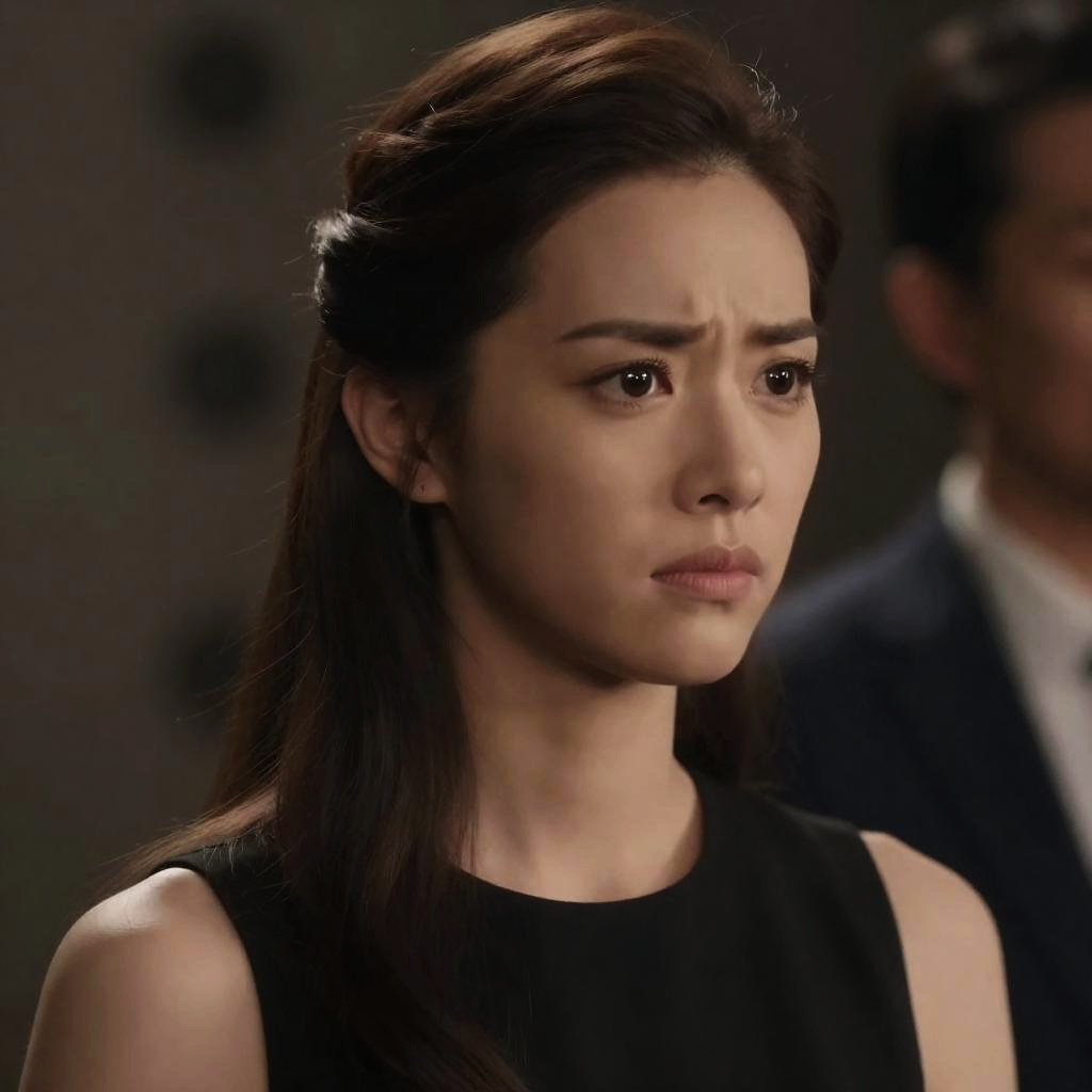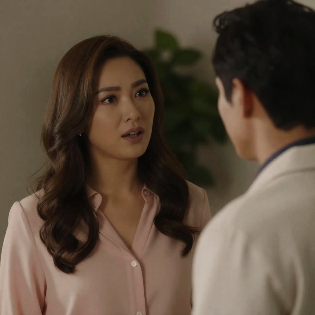 Photograph of a woman with voluminous brown hair, pink blouse, and light skin, facing a man with dark hair, white jacket, and dark tie. Dimly lit background with green plant. Woman's expression is slightly open-mouthed, looking at man. Man's back is to the camera. Intimate conversation.