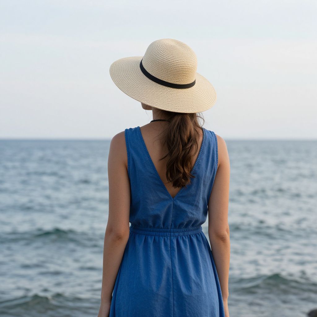 Photograph of a woman with her back to the camera, standing at the ocean's edge. She wears a wide-brimmed, off-white straw hat with a black ribbon, and a sleeveless, deep V-neck blue dress that cinches at the waist. Her brown hair is tied in a low ponytail. The background features a calm, slightly rippling ocean under a clear, pale blue sky. The image emphasizes a serene, summery atmosphere with soft, natural lighting.