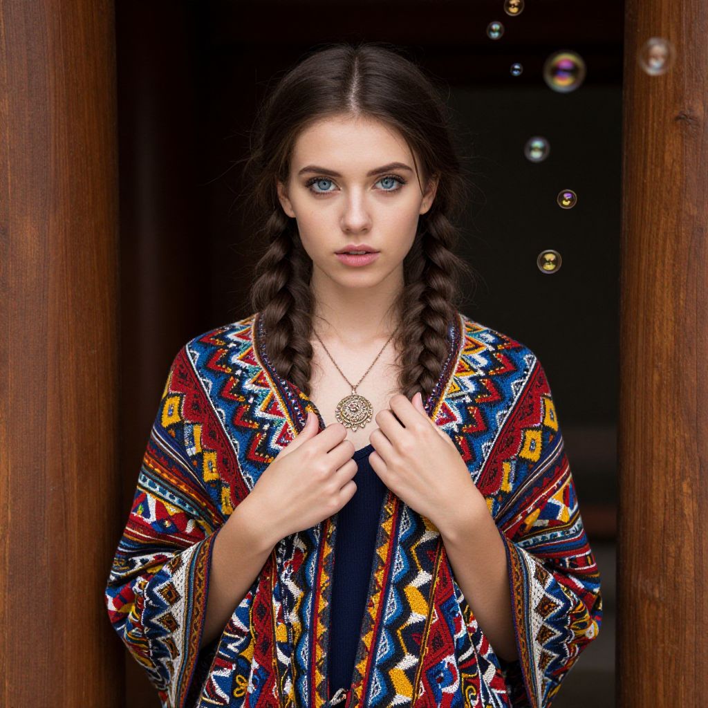 Photograph of a young woman with fair skin and striking blue eyes, standing in a wooden doorway. She has long, dark brown hair styled in two braids. She wears a vibrant, multicolored, geometric-patterned shawl over a black top, and holds a large, ornate, gold pendant necklace. The background is dark, with subtle reflections of bubble-like lights. Her expression is serious and focused, with slightly parted lips. The image has a vivid, almost digital quality, with sharp details and bold colors.