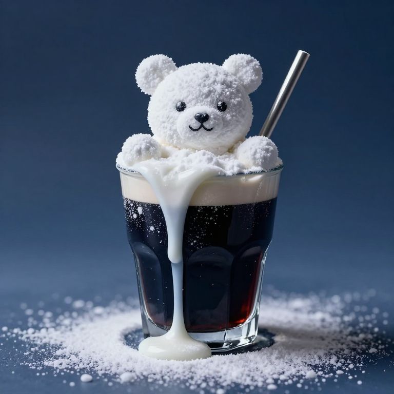 Photograph of a glass filled with dark soda, topped with a generous amount of whipped cream and a small, white, sugar-coated teddy bear. A metal straw is inserted into the whipped cream. The glass stands on a dark blue surface, with white sugar crystals scattered around. The background is a gradient of dark blue to black, creating a cool, contrasted effect. The teddy bear has a cute, simple face with small black eyes and a smile. The whipped cream drips down the sides of the glass. The overall composition is whimsical and playful.