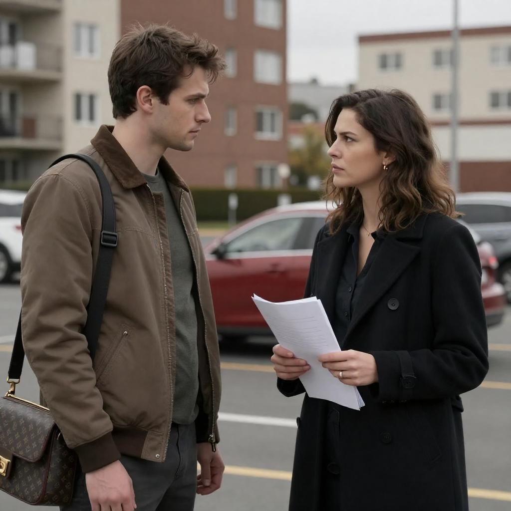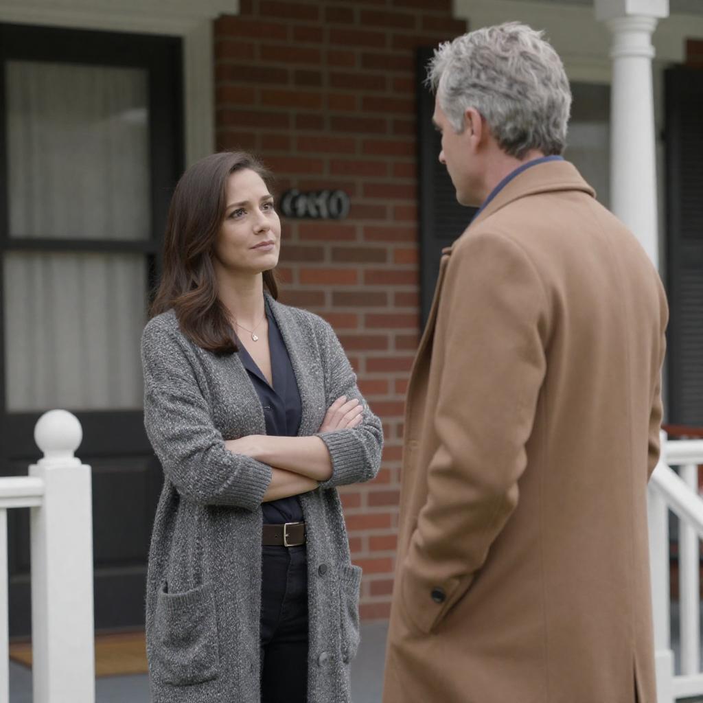 Photograph of two people standing on a brick porch. Woman with brown hair, grey patterned cardigan, arms crossed, looking at man. Man with short grey hair, brown coat, facing her. Brick house, white railing, number "4400" on wall.