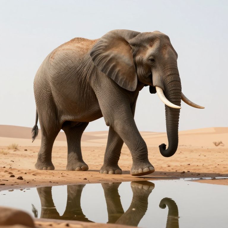 A majestic 3D-rendered elephant strides across a serene desert landscape, its reflection shimmering in a shallow pool of water beneath its massive feet, evoking a sense of timeless tranquility and digital artistry.