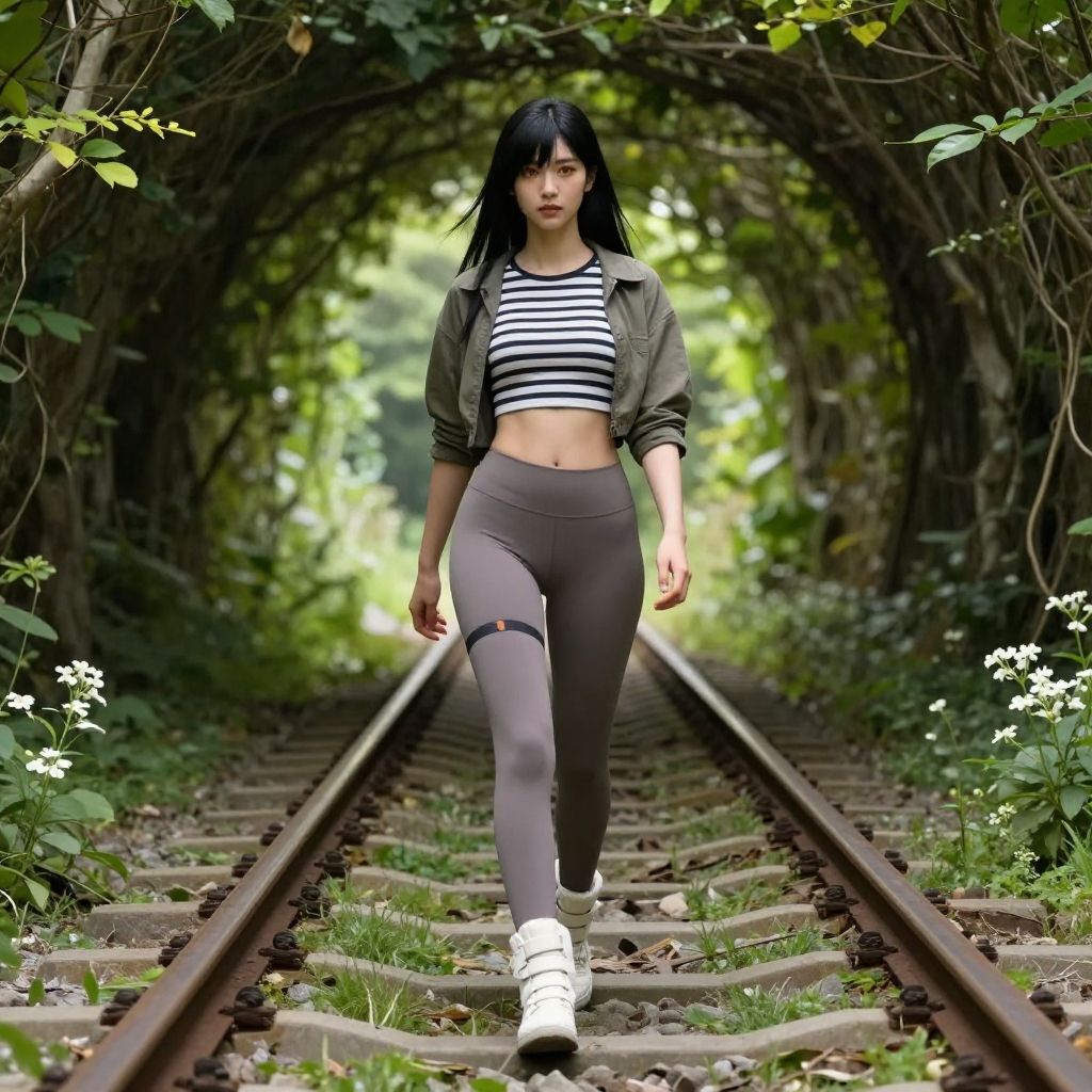 Cinematic, raytracing, long hair, black hair, asymmetric bangs, orange eyes, flat chest, wide hips (full body, 1girl, solo:1.2), crop top jacket, striped shirt, thigh strap, midriff, yoga pants, white boots with velcro straps, bodystocking (walking through a natural tunnel of leaves:1.2), train tracks, sunlight visible through leaves, round tunnel, moss, grass, white flowers