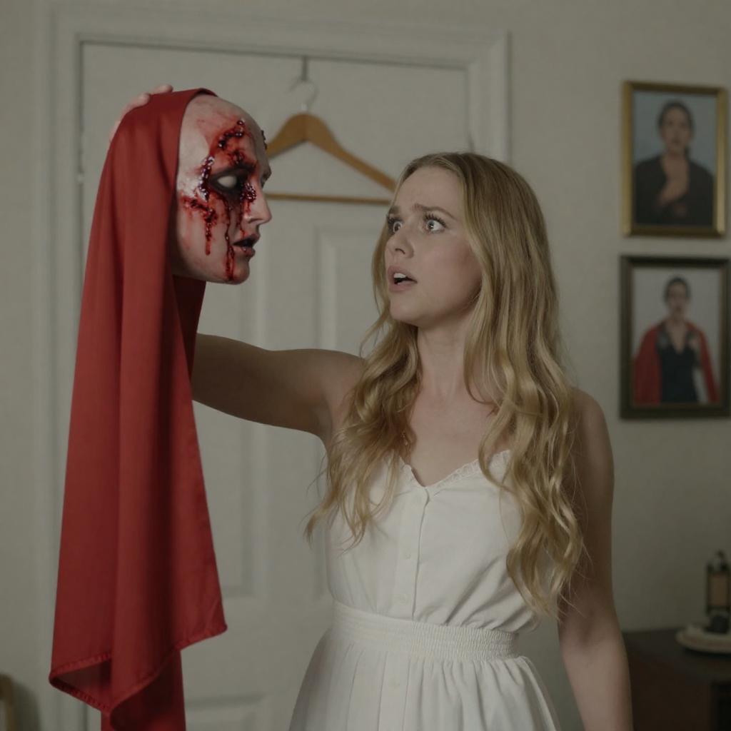 Photograph of a frightened woman with wild blonde hair and an open mouth, facing an older, heavily scarred man with a creepy grin, wearing a red and green striped sweater and hat. Background includes a shadowy figure with claws. Both characters are centered, with the woman on the left and the scarred man on the right.