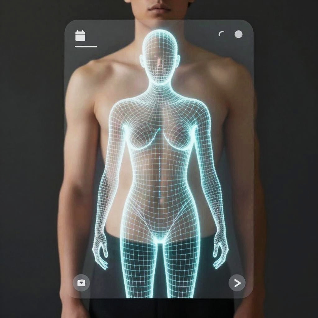 Visual representation of deepfake clothes remover app AI at work, abstract glowing data streams and digital mesh reconstructing human form without clothes, futuristic user interface layered over a blurred realistic human figure, high-tech minimalistic style