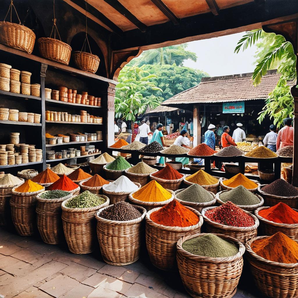 A lively outdoor street market at twilight with vendors selling colorful handmade crafts and textiles. The market is decorated with multicolored fabric flags and hanging lanterns, creating a warm and festive atmosphere. People walk along the cobblestone path browsing the diverse stalls, illuminated by soft evening lights.
