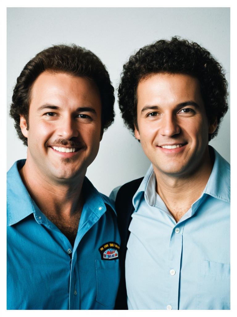 Two men dressed in Step Brothers movie poster costumes with retro afro hairstyles. One man wears a blue polo shirt and the other a white polo shirt, both with patch logos. They are posing with thumbs-up against a plain backdrop, capturing a playful cosplay festival portrait style.