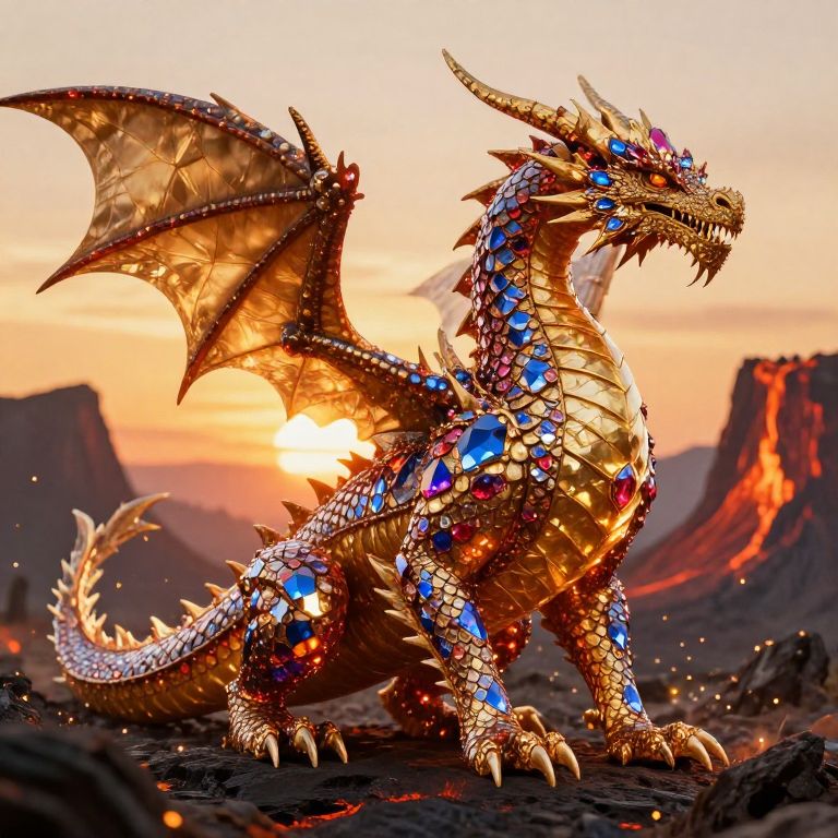 A majestic dragon with jeweled scales embedded in its armored hide, each scale faceted like sapphires and rubies, glowing softly in a volcanic glade at sunset, embers dancing around it, fantasy art style, high detail, warm golden lighting, dramatic shadows.