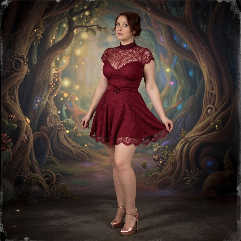 A lanky woman, Collodion wet plate style, in a romantic deep red lace mini dress with a high collar and short sleeves, cinched waist, and scalloped hem, metallic rose gold heels with ankle strap, standing in a Wonderland cavern with luminescent walls, admiring the glowing surroundings. Sexy. Pretty face and beаutiful eyes. Big breasts