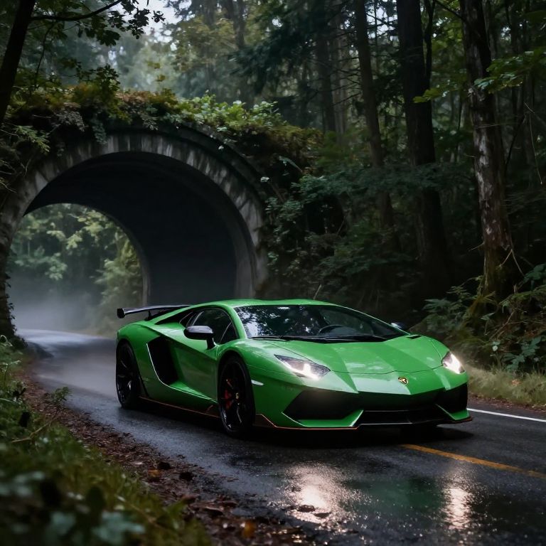 A forest green Lamborghini emerging from a tunnel carved through thick forest, sleek contours highlighted by streaks of light, wet road reflecting car and trees, moody twilight scene with mist hovering over the ground, ultra-detailed digital art