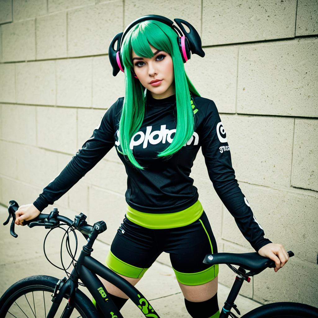 Photo-realistic cosplay photo of person in agent 3 (splatoon) costume. 1girl, pointy ears, tentacle hair, long hair, green hair, blunt bangs, bike shorts, long sleeves, squidbeak splatoon, squidbeak splatoon, headgear
