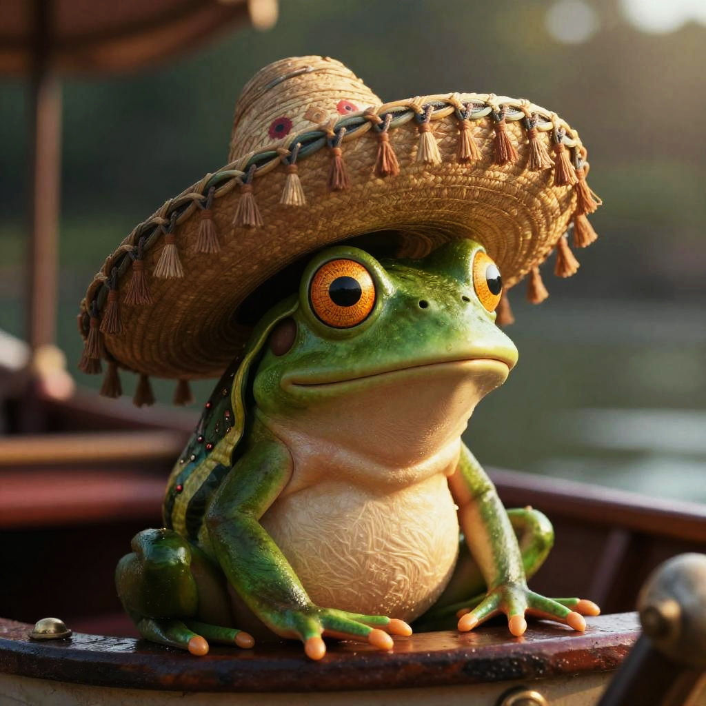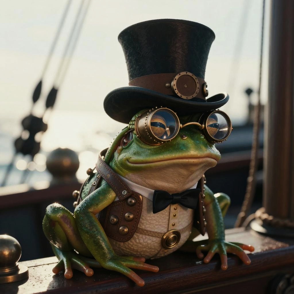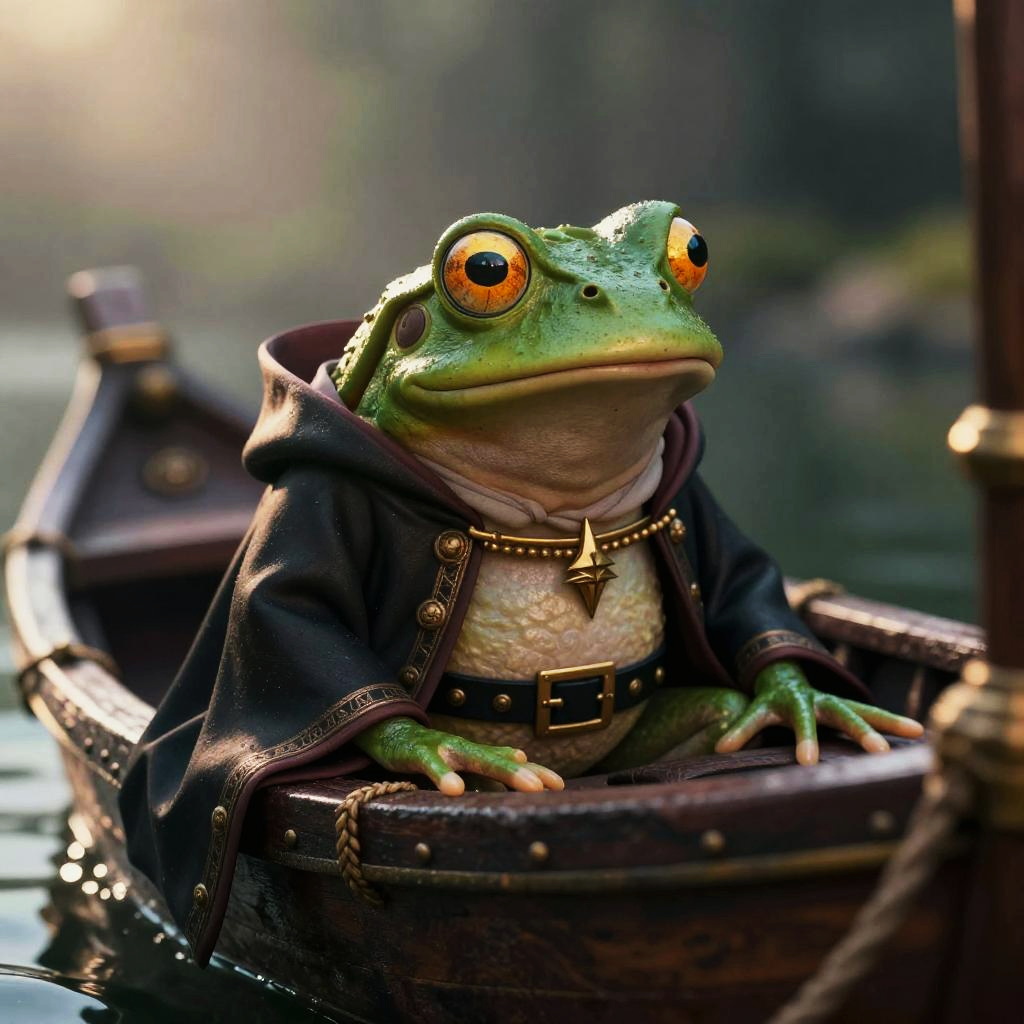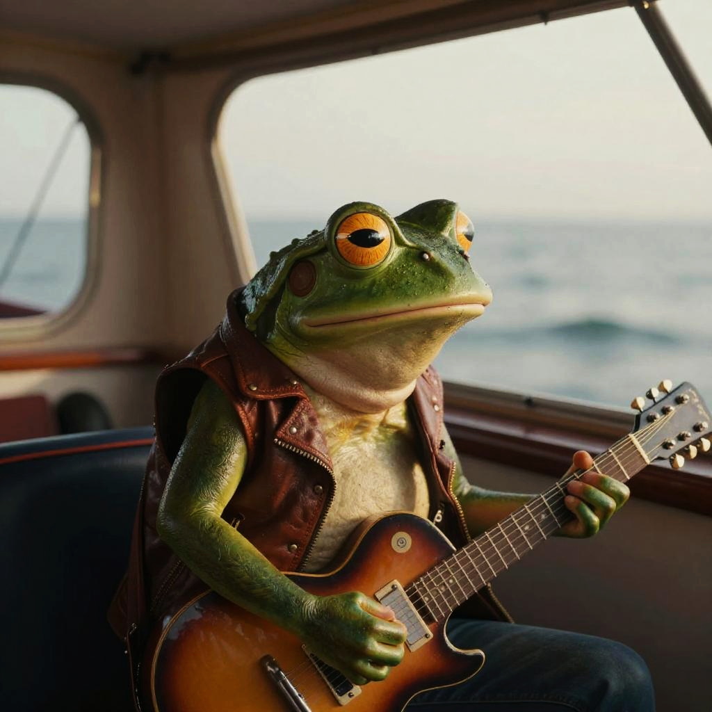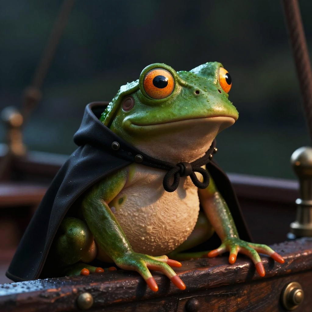 Pepe the Frog in a space suit, on a boat, intricate details, cinematic lighting, editorial photography, shot on 35mm, moody lighting, backlight, depth of field, 32k, hyper-detailed