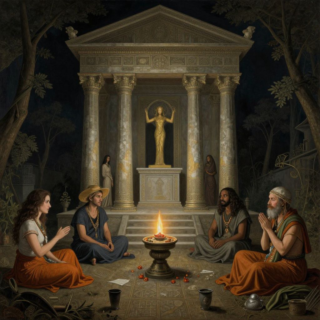 Reggae band in the temple of thoth, by dave dorman hieronymus bosch, cyril rolando, esher and natalie shau, whimsical, profound, impossible, dark, atmospheric, brooding, digital painting, intricate.
