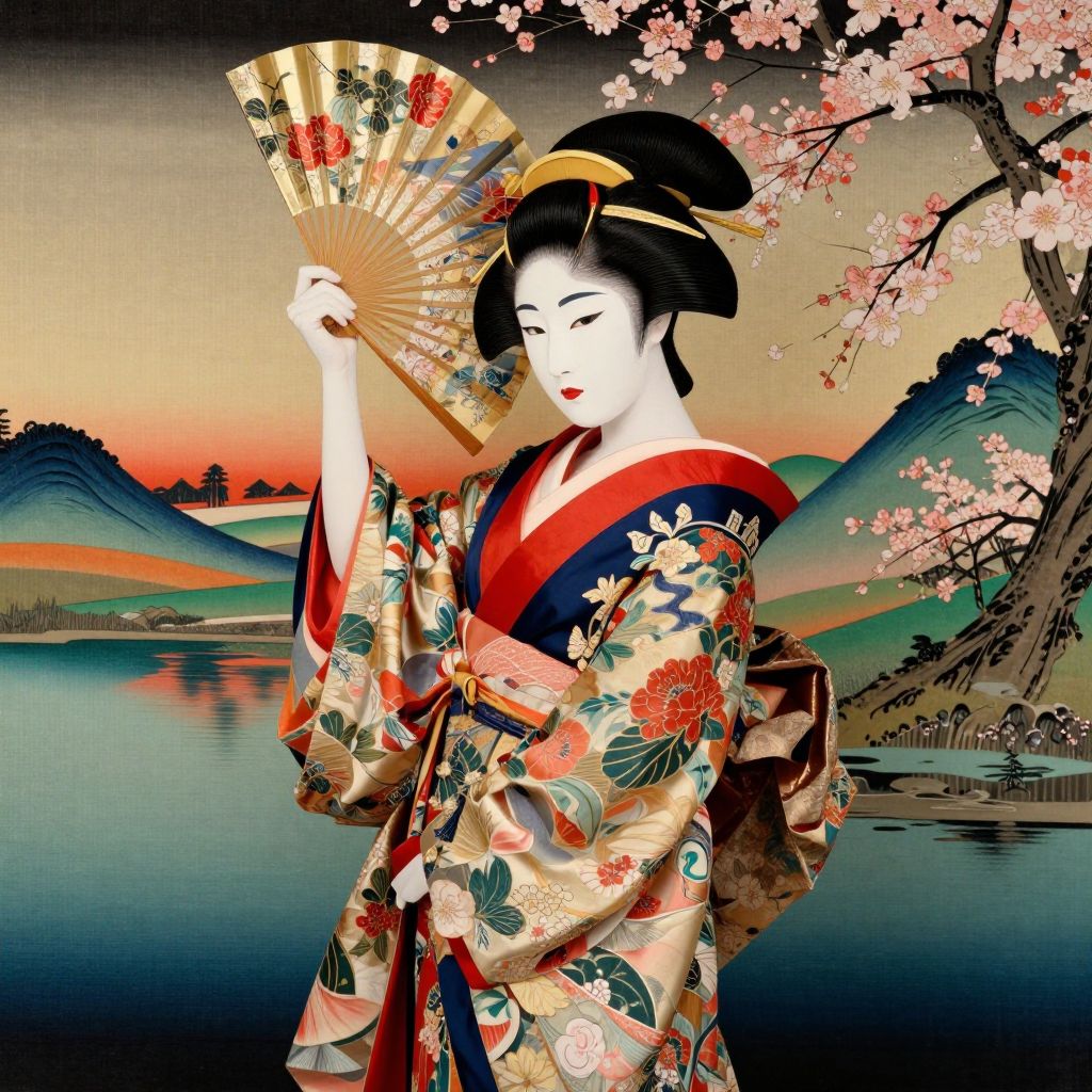 Stylized digital art of a Japanese woman in a floral kimono holding a fan, standing by a serene lake with cherry blossoms at sunset.