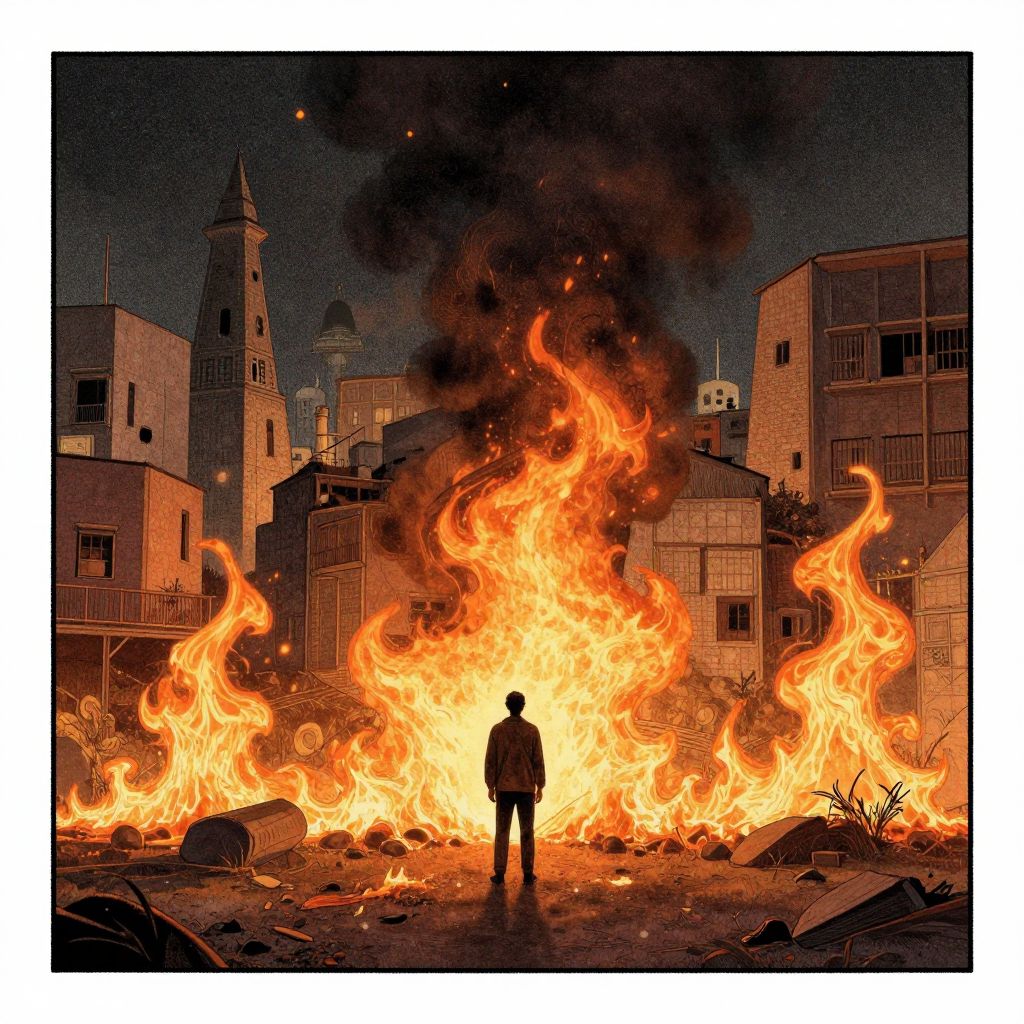 Burning overgrowth, a lone man, habitat 67, mads berg, karolis strautniekas, film noir, stippled light, dramatic lighting,editorial illustration, detailed,fine texture, matte print