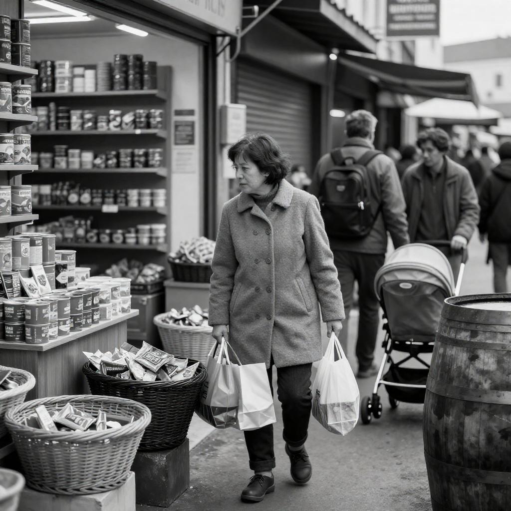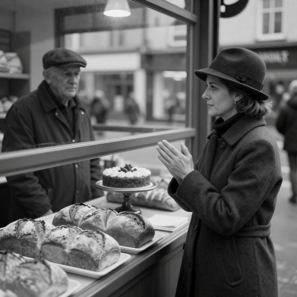 Black-and-white photograph of a woman and older man in a busy market stall. Woman with short, wavy hair, wearing patterned blouse and cardigan, looking surprised. Man with glasses, beard, and vest, holding cloth, looking at woman. Background shows blurred market activities. Woman's right hand on fabric, man's left hand on cloth.