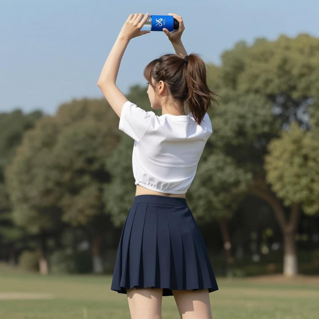 Asian woman with long black hair, wearing black jacket, plaid skirt, dark socks with small pink dots, black loafers, black leather backpack, bending over to adjust white lamp on brick pillar. Tree and white building in background. Street in foreground. Number of people: 1.