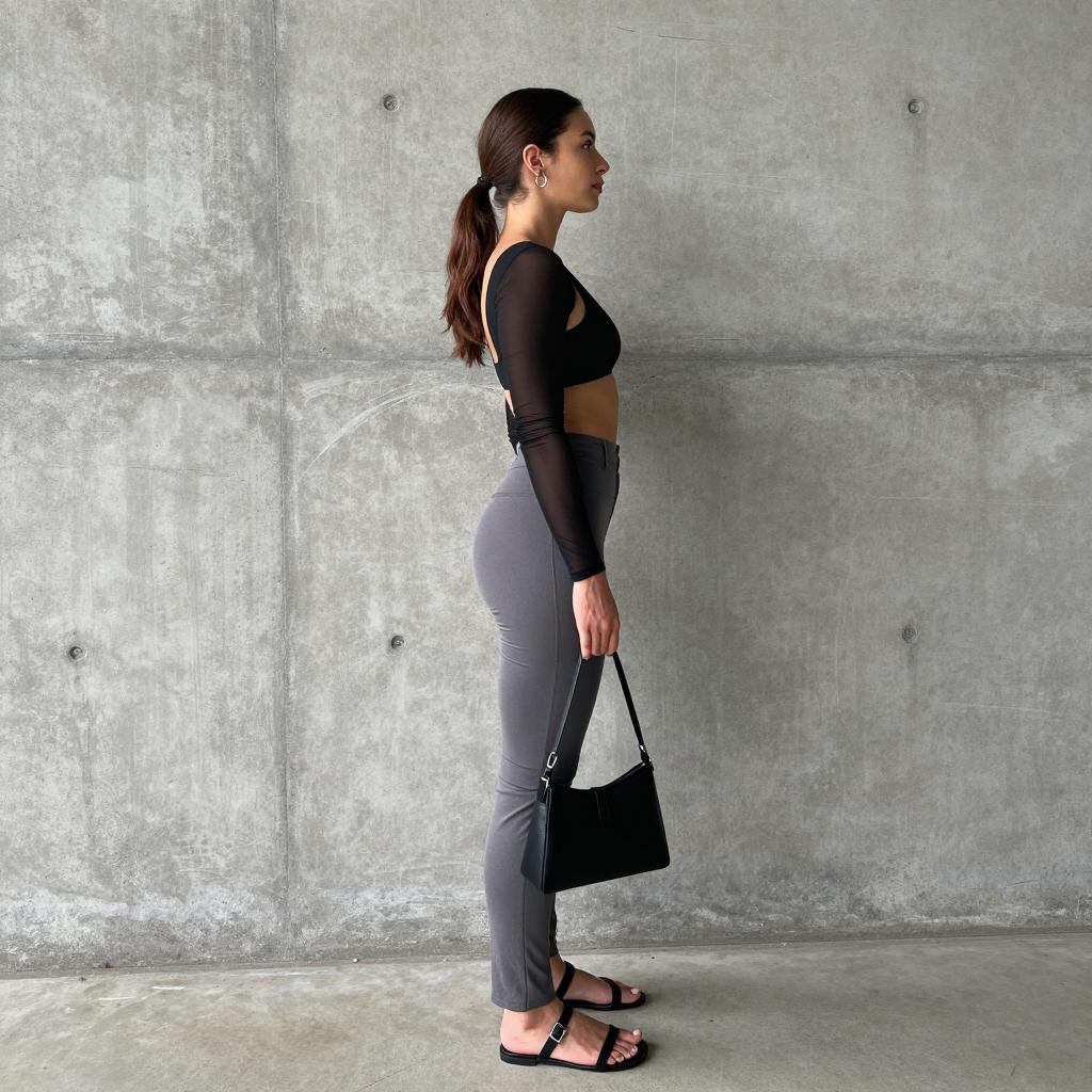 Woman with light skin, brown hair in a bun, wearing black long-sleeve top, black skirt with a flared bottom, black tights, black flats, removing a black jacket. Standing on a gray pavement, brick wall in background, green grass and small plants near base. Arms raised, hands in hair. Straight posture, legs slightly apart. Photograph.