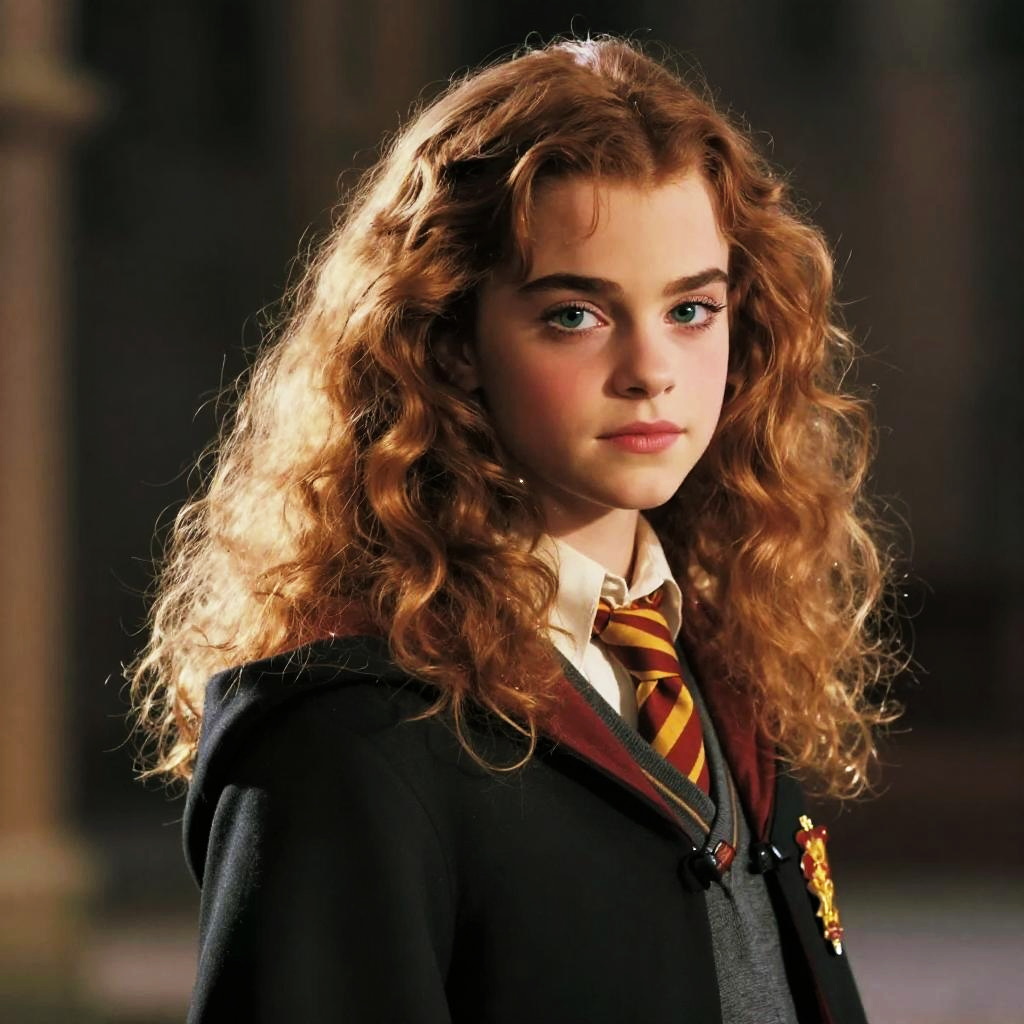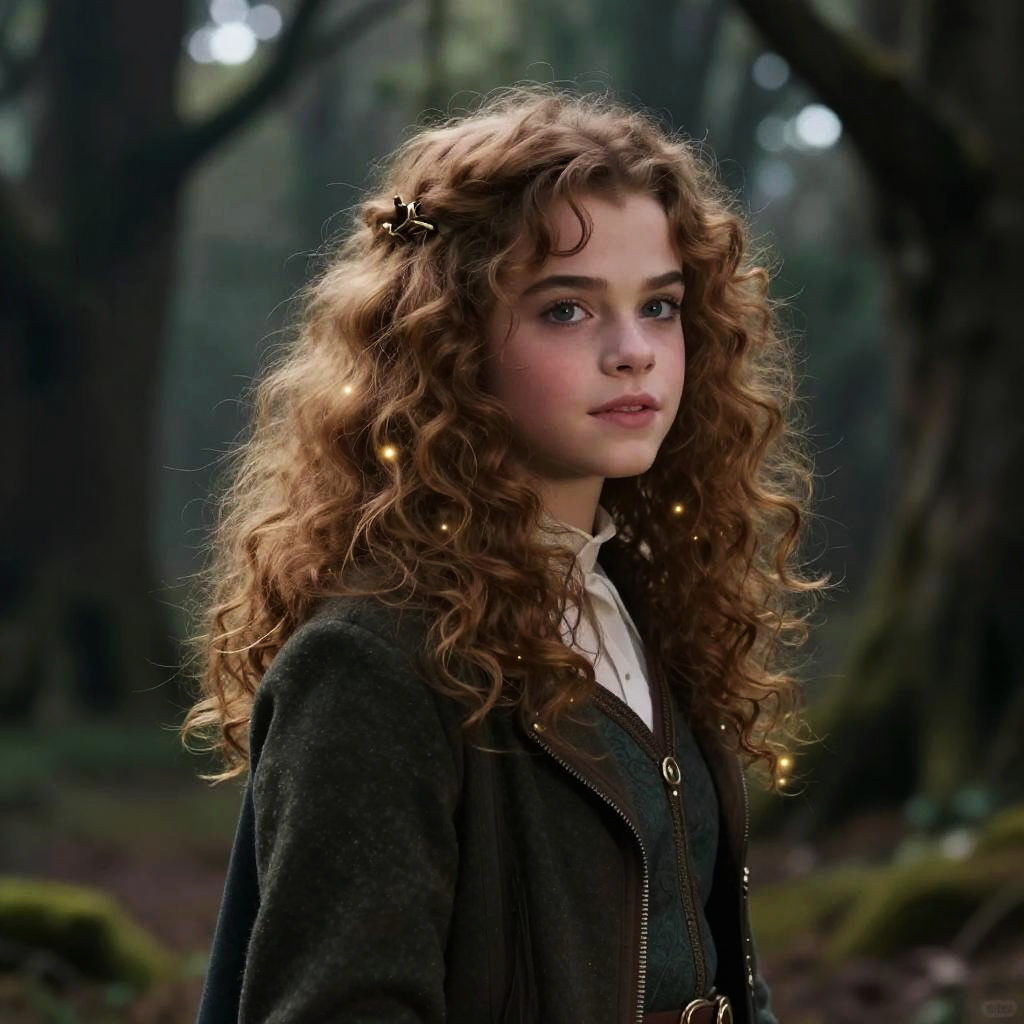 Hermione hot, fantasy portrait of a confident young woman with flowing chestnut hair, intense green eyes, and magical aura, detailed intricate robes, soft glowing light, photorealistic style