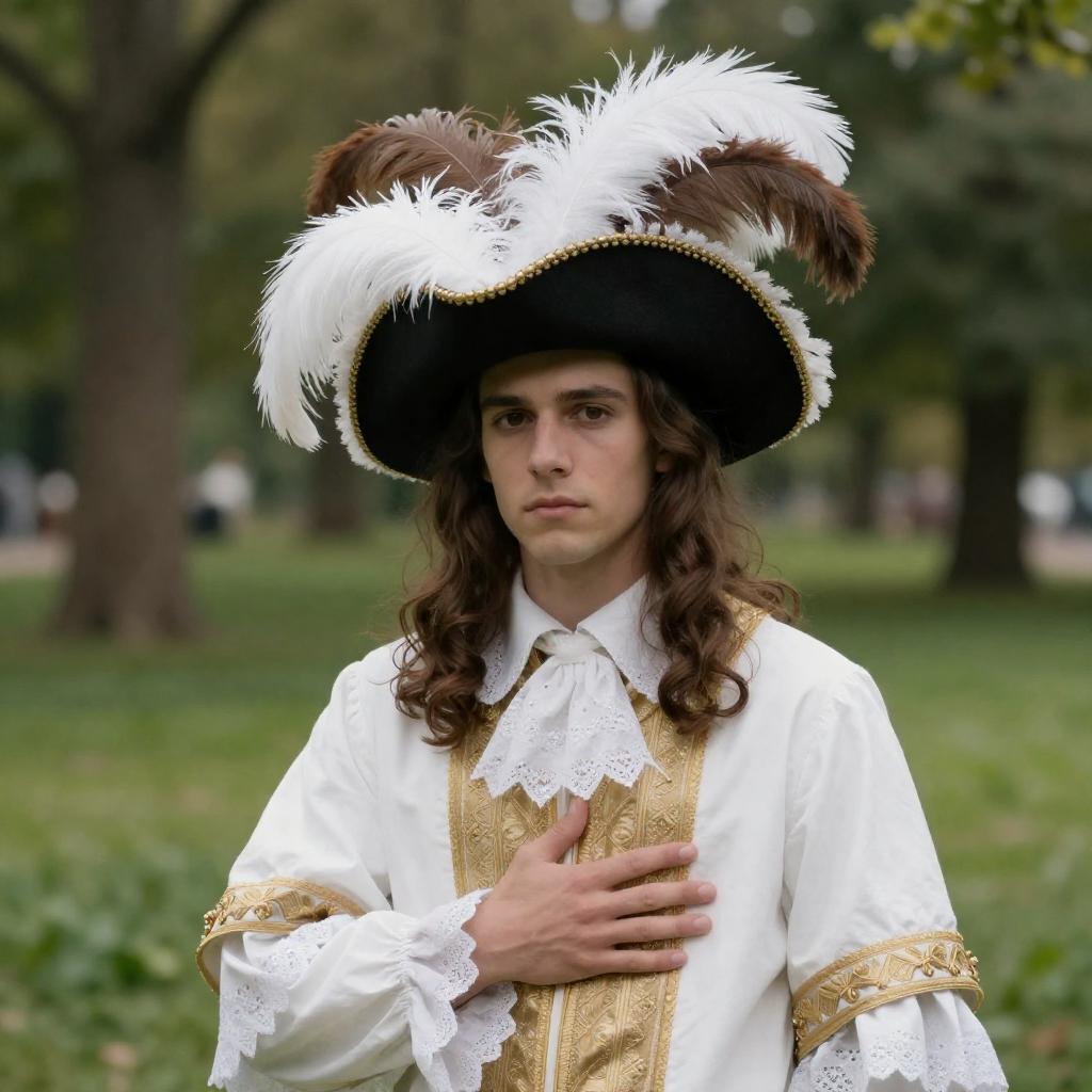 Photograph of a young man in elaborate 17th-century attire, standing in a lush green park. He wears a large, black, feathered hat with white and brown plumes, and a white, gold-embroidered robe with lace trim. His expression is serious, with one hand resting on his chest. Trees and grass fill the background.