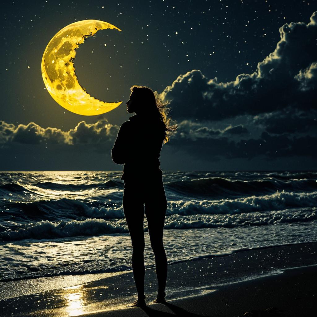 Butterfly-shaped cloud formation broken, fissured with moderately cracked pieces missing, a few large pieces broken off splashing into the stormy ocean, soft pink moon high in the sky in the shape of a heart, twilight sky, photorealistic, highly detailed, close-up tall moonlight backlit silhouette of a child spinning with arms wide open, standing on a beach seascape with stormy waves crashing and splashing
